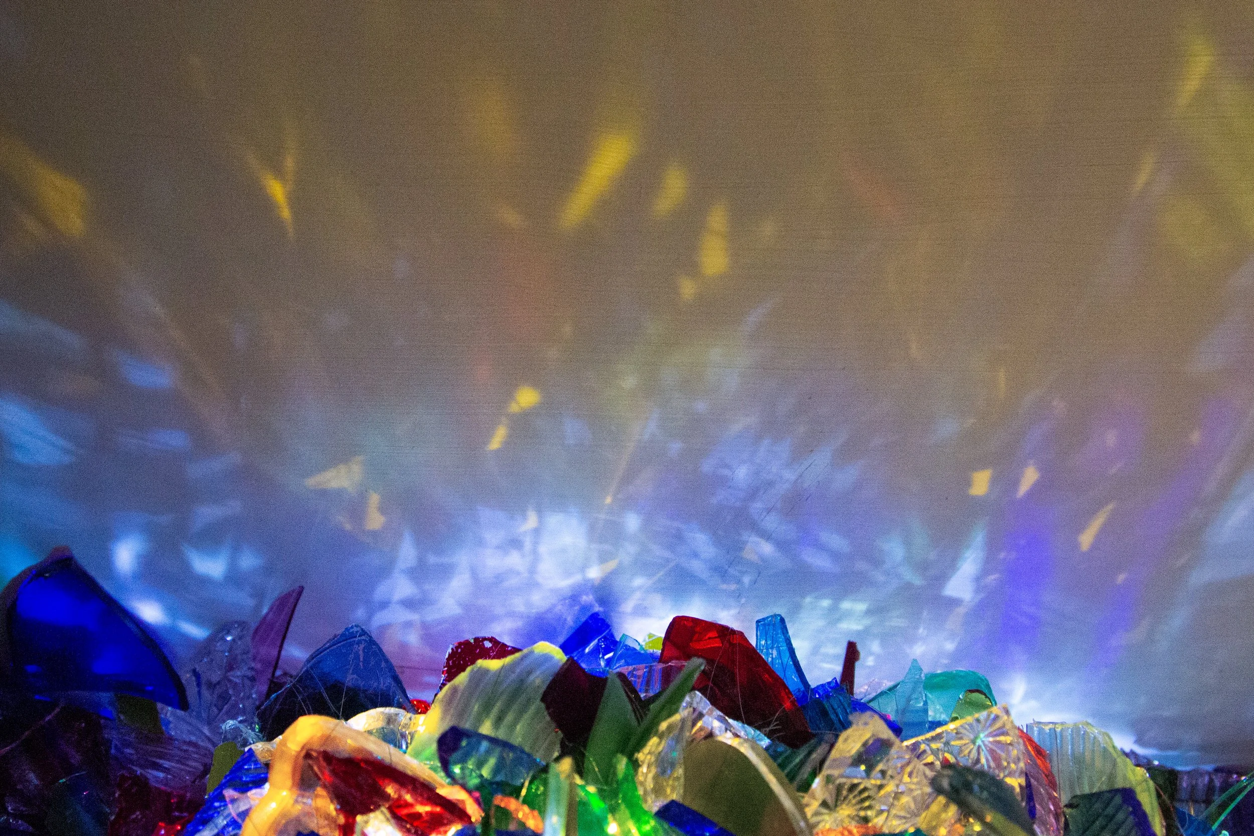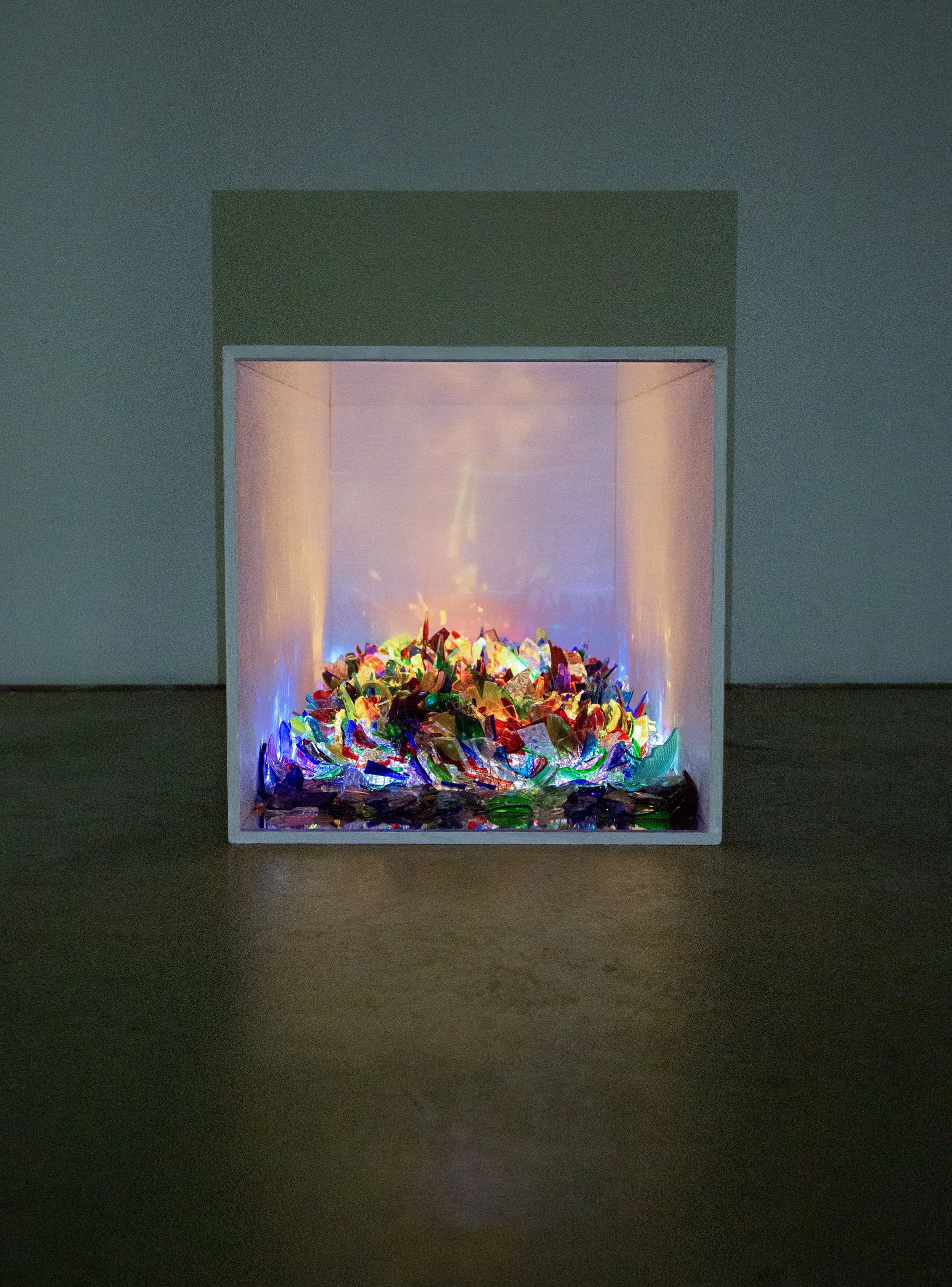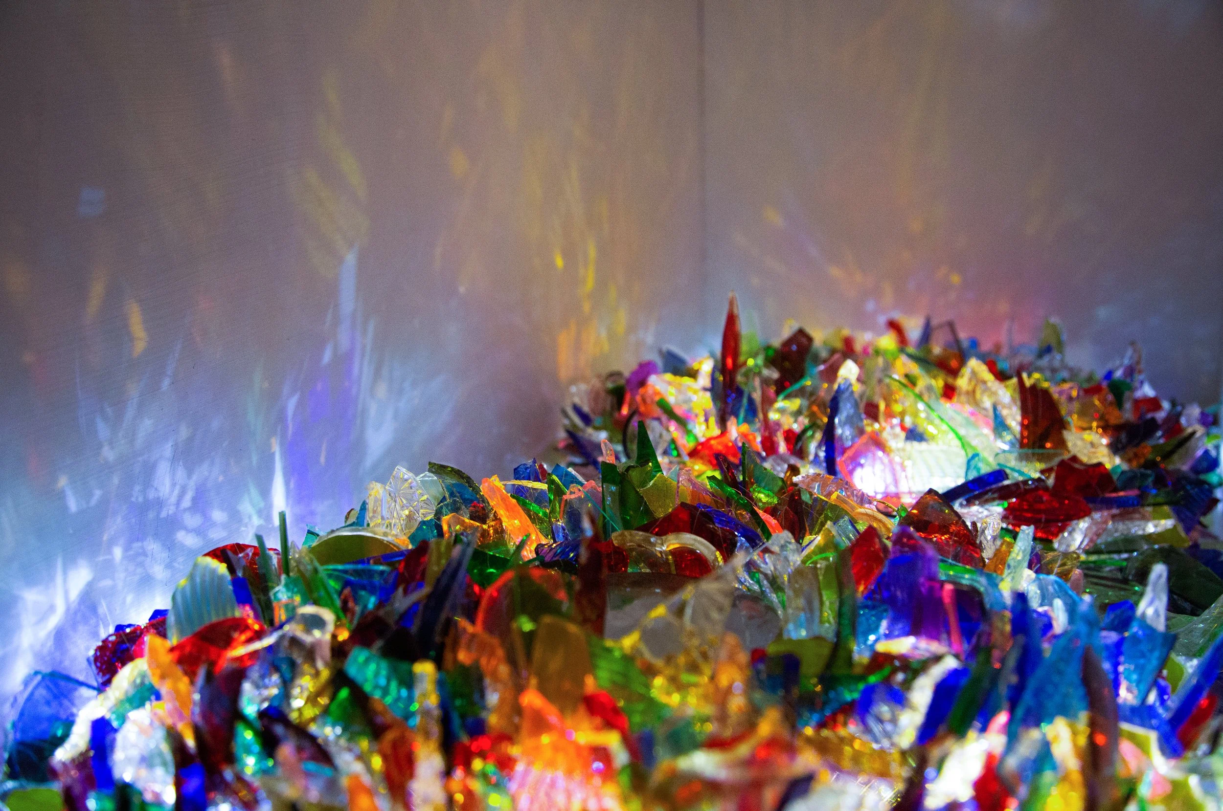 Bric-a-brac glass, fan guard, aluminium wire, glue, mirrored perspex, MDF, acrylic paint, mini LEDs
